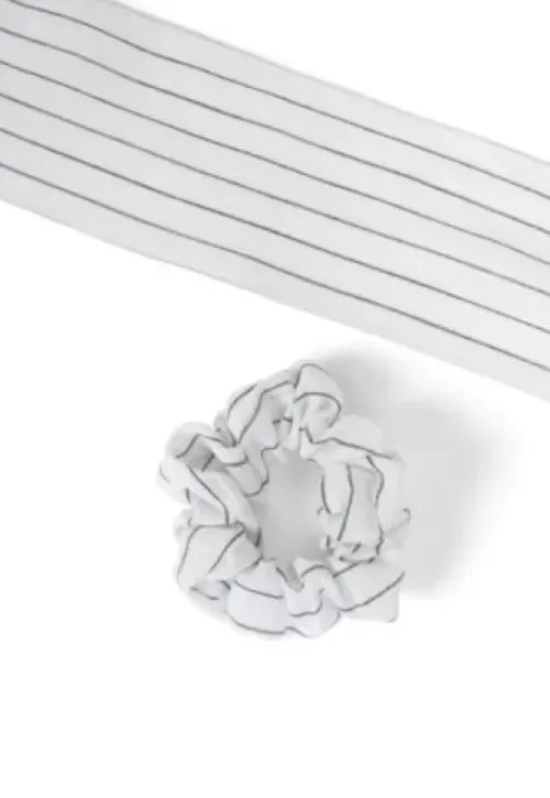 Beide Scrunchies mit Schleife können vielfältig getragen werden. Das Scrunchie mit Band verleiht der Frisur eine tolle Wirkung. Die Schleife kann geöffnet und separat als Haarband getragen werden und das Scrunchie ohne Band ist in der Alltagsfrisur ein tolles Accessoire. Das Scrunchie gibt es einmal in Weiss mit schwarzen Streifen und einmal in hellblau mit weissen Streifen. Das Scrunchie hat einen Durchmesser von 8 cm, die Schleife ist 16 cm breit und 20 cm lang und das Haarband ist ca. 70 cm lang und 9 cm breit.
