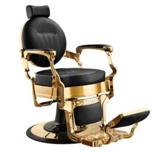 Raffinierter Barberstuhl mit einem Vollmetallgestell aus gespritztem Aluminium. Runder Sockel und komplette Struktur mit goldverchromter Oberfläche. Umkehrbare Fussstütze.