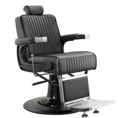 Stabiler Barberstuhl, mit einem Gestell aus Aluminium-Spritzgussteilen. Sitz mit hochdichtem Schaumstoff für maximalen Komfort. Polsterung mit vertikalen schwarzen Nähten.