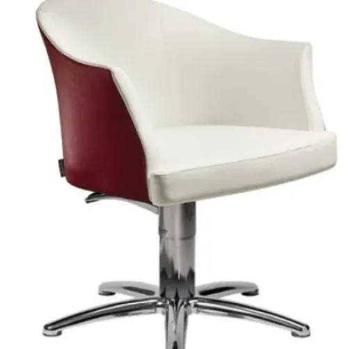 Dieser moderne Frisierstuhl mit runder Rückenlehne und geschwungenen Armlehnen erregt Aufsehen. Er passt sich demensprechend perfekt Ihrem Salon an.