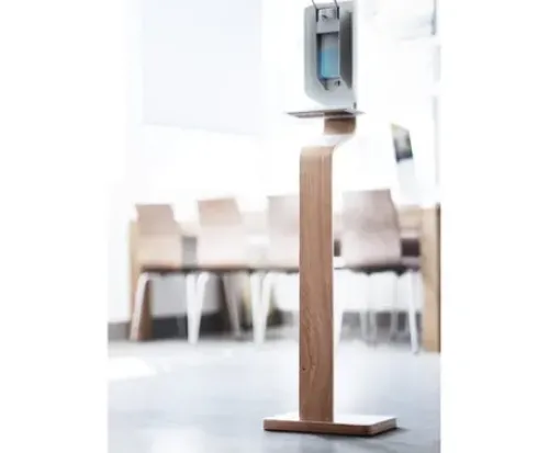 H.U.G.O. ist mehr als ein Desinfektionsspender, wirkt wie ein Objekt aus feinem Holz mit natürlicher Anmutung. Geformt mit einem aufwändigen Herstellerprozess, dank unsichtbarer Oberflächenlackierung unempfindlich gegen mechanische oder chemische Einflüsse, beweist er als Designobjekt, wie sich ein „Must“ zum „Must-have“ wandelt. Eleganz und Funktion auf einer Linie, die formvollendet zur Händedesinfektion motiviert.