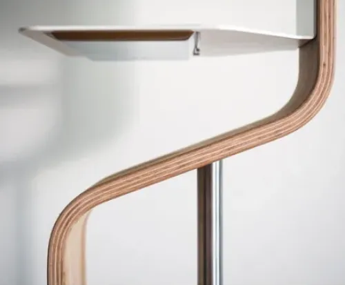 - Zweifach gebogenes Formholz und Eiche-Edelfurnier auf Buchekern.