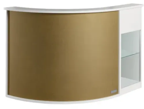 Die Theke mit dem aussergewöhnlichen Design beeindruckt durch seine elegante geschwungene Form. Die gebogene Thekenfront ist mit Bezugsstoff überzogen. Auf der Innenseite befindet sich ein Ablagefach sowie eine Schublade für zusätzlichen Stauraum.