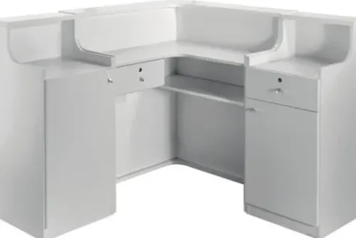 Die Theke mit dem 90 Grad Winkel zieht die Aufmerksamkeit Ihrer Kunden sofort auf sich! Die rechtwinklige Thekenfront ist mit Bezugsstoff überzogen. Auf der Innenseite befindet sich ein Ablagefach sowie eine Schublade für zusätzlichen Stauraum.