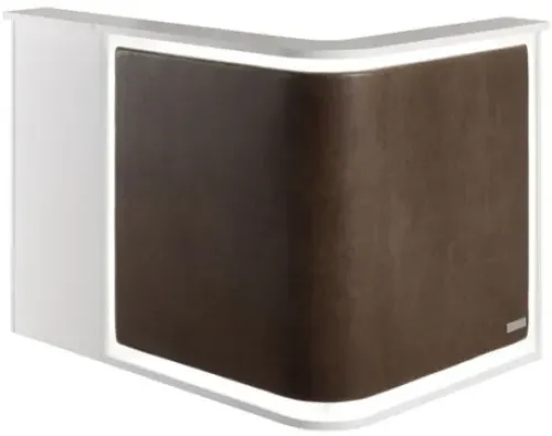 Die Theke mit dem 90 Grad Winkel zieht die Aufmerksamkeit Ihrer Kunden sofort auf sich! Die rechtwinklige Thekenfront ist mit Bezugsstoff überzogen. Auf der Innenseite befindet sich ein Ablagefach sowie eine Schublade für zusätzlichen Stauraum.