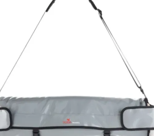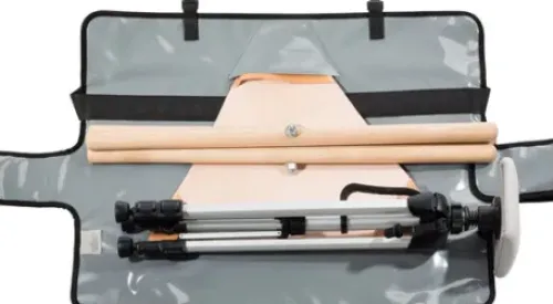Transportmittel mit Schultergurt für Fussstütze und/oder Arbeitshocker bei Einzelnutzung.