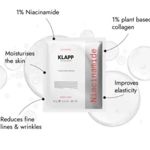 Die Triple Action Refine Sheet Mask, angereichert mit 1 % Niacinamide und 1 % pflanzlichem Kollagen: versorgt die Haut mit Feuchtigkeit und verbessert die Elastizität.