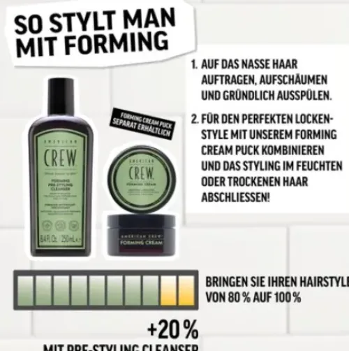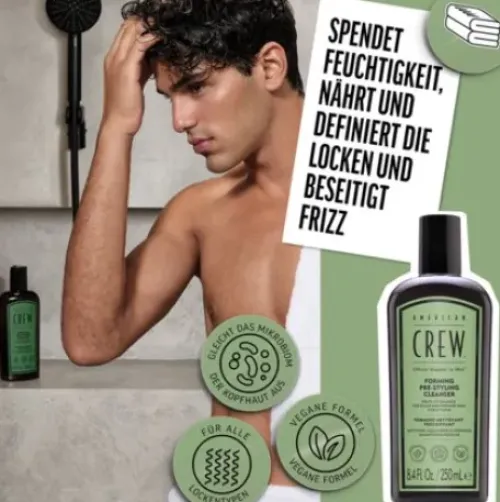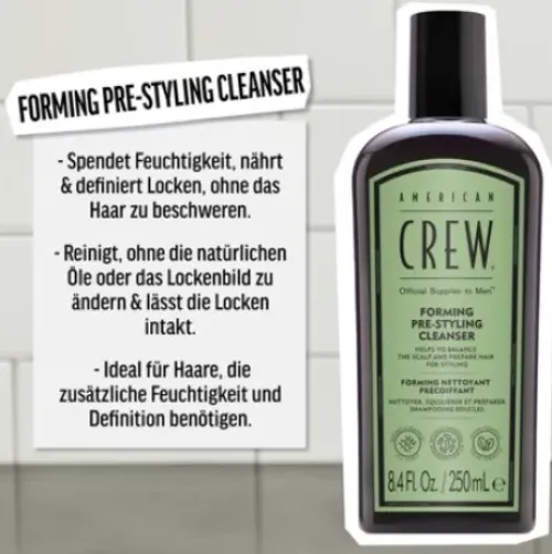 - Der American Crew Forming Per-Styling Cleanser wird auf nasses Haar aufgetragen und sanft in die Kopfhaut und das Haar einmassiert, um Schmutz und Öl zu entfernen.
