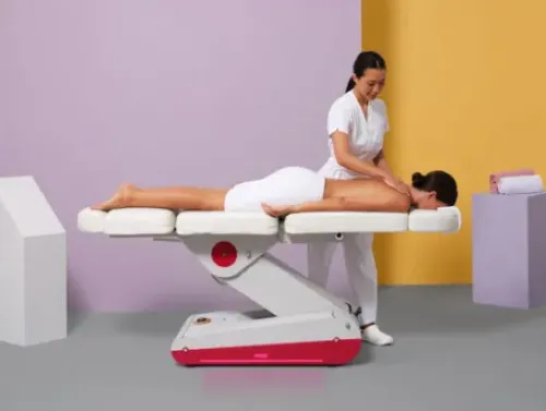 Professionelle Kosmetikliege und Multitalent. Über den Handschalter wird die elektrische Höhen-, Rückenlehne-, Fussteil- und Sitzwinkelverstellung in die gewünschte Position gebracht.