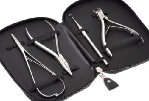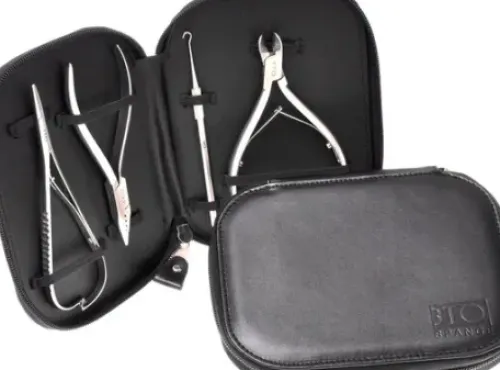 Für die Anwendung der 3TO-Spange® werden unterschiedliche Instrumente zur Drahtbearbeitung und zum Anbringen der Spange benötigt. Alle benötigten Zangen und der Windehaken sind im 3TO-Instrumentenset enthalten. Sie sind praktisch im schwarzen Textilleder-Etui verstaut und so immer griffbereit für den nächsten Spangenpatienten. Der enthaltene Seitenschneider ist für alle 3TO-Spangen® und 3TO-Schlaufen sowie podofix® und COMBIped® geeignet. Andere Spangen bis zu maximal 0,45 mm Drahtstärke können ebenso problemlos damit bearbeitet werden.