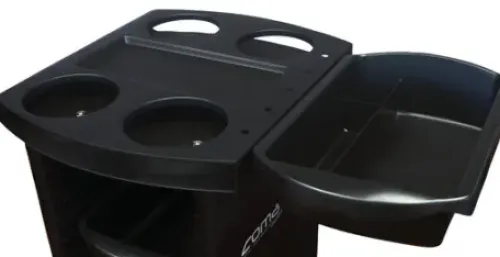 Der Comair Color Boy – perfekt, um alle Färbeutensilien zu verstauen: 4 Aussparungen für Färbeschalen, eine Ablagefläche in der Mitte und 5 Vorrichtungen, in die die Färbepinsel gesteckt werden können.