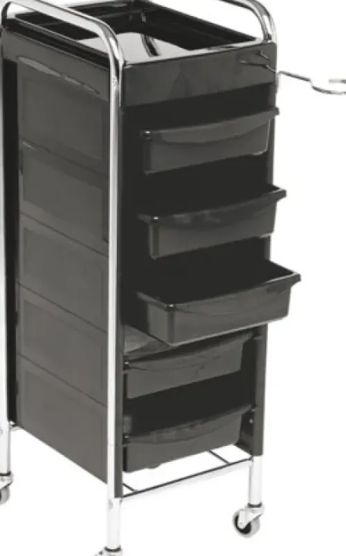 Service-Boy mit 5 beidseitig herausziehbaren, stabilen Schubladen. Gestell und Föhnhalter verchromt. H 93 x B 31 x T 40 cm. Passende Ersatzrollen und Seitenanhänger ) erhältlich.