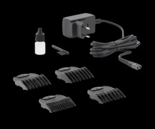 INCLUSIVE: 4 Aufschiebekämme 3, 6, 9, 12, energieeffizienter Steckertrafo, Reinigungsbürste, Öl.