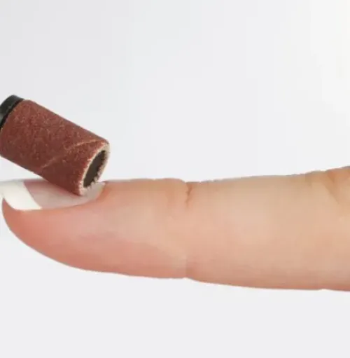 Sandpapier-Manschetten gibt es in unterschiedlichen Körnungen. Die Manschetten werden über einen Mandrel gezogen und machen so aus der guten alten Handfeile eine flotte runde Sache. Die Steinschleifkörper sind sehr gut geeignet für das Ausdünnen von starken Nagelverdickungen.