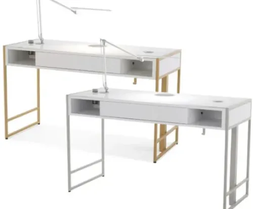 Die Platte ist mit einer Glasauflage in Planilaque weiss ausgestattet. In die Platte integriert ist eine Induktionslademöglichkeit für mobile Endgeräte, eine Trinkgelddose, sowie die Befestigung für die leistungsstarke, dimmbare LED-Arbeitsplatzleuchte mit einstellbarer Lichtfarbe.